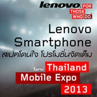 Lenovo Smartphone โปรโมชั่นจัดเต็มในงาน Thailand Mobile Expo 2013 พิเศษรับฟรี! ของสมนาคุณมากมาย เมื่อซื้อ Lenovo Smartphone ภายในงาน และลุ้นรับสิทธ์แลกซื้อ Lenovo S920 ในราคาเพียง 3,990 บาท