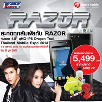 Razor สมาร์ทโฟนที่ถูกพูดถึงมากที่สุด ในรุ่นของสมาร์ทโฟนทั้งหมดจากเชอร์รี่โมบาย โทรศัพท์ Android ราคาคุ้มค่าที่สุด ด้วยวัสดุที่ใช้ในการป้องการขีดข่วนด้วย Dragon Trail glass และด้วยชื่อเสียงในด้านของความบาง บางที่สุดในรุ่นของคู่แข่งในตลาด มาพร้อมกับโปรโมชั่นพิเศษ ในงาน Thailand Mobile Expo 2013 เท่านั้น ท่านใดที่สนใจโปรโมชั่นพิเศษสุดนี้ จาก Cherry Mobile