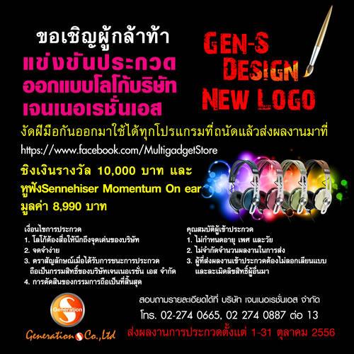 ขอเชิญผู้กล้าท้า แข่งขันประกวดออกแบบโลโก้บริษัท Generation-S ชิงเงินรางวัล 10,000 บาท และหูฟัง Sennehiser Momentum On ear มูลค่า 8,990 บาท สามารถใช้ได้ทุกโปรแกรมที่ถนัด ส่งผลงานมาได้ที่ www.facebook.com/Multigadgetstore ตั้งแต่ 1-31 ตุลาคม 2556
