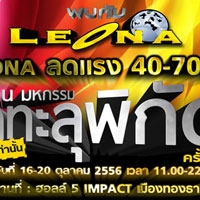 เชิญเลือกซื้อสินค้า Leona ราคาพิเศษและโปรโมชั่นสุดคุ้มได้ที่บูธ Leona ตั้งแต่ 16-20 ตุลาคม 2556 เวลา 11.00 – 22.00 น. ที่ฮอลล์ 5 อิมแพค เมืองทองธานี หรือสอบถามข้อมูลโทร. 0-2945-4507-12 เว็บไซต์ www.leonathai.com และติดตามความเคลื่อนไหวทางเฟสบุ๊ค www.facebook.com/LeonaThai