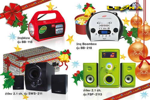 อาทิ ชุดของขวัญลำโพง 2.1 Leona รุ่น SWS-211 ราคาพิเศษ 990 บาท (พิเศษสุดๆ เมื่อซื้อ 10 เครื่องแถมฟรีอีก 1 เครื่อง) ชุดลำโพง 2.1 Leona รุ่น FSP-2113 (สีเขียว) ราคาพิเศษชุดละ 1,990 บาท (เมื่อซื้อ 5 เครื่องขึ้นไปลดอีกเหลือราคาพิเศษเพียงชุดละ 1,890 บาท) วิทยุกระเป๋าหิ้วพกพารองรับคลื่นวิทยุ FM/AM ไฟล์ MP3 เสียบ USB และ SD Card รุ่น BB-218 ราคาพิเศษ 690 บาท (จากราคาปกติ 990 บาท) และวิทยุไฟฉายรองรับคลื่นวิทยุ FM/AM ไฟล์ MP3 เสียบ USB และ SD Card รุ่น BB-118 ราคาพิเศษ 399 บาท (จากราคาปกติ 590 บาท)