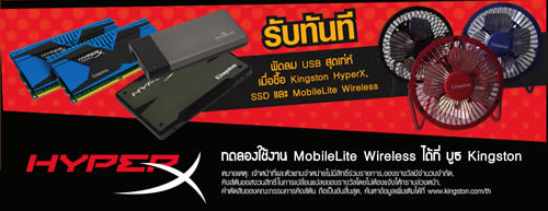 ภายในบูธคิงส์ตัน จะทำให้สาวกไอทีต้องตะลึงไปกับความอลังการ แห่งสายพันธุ์ HyperX ด้วยการสาธิตผลิตภัณฑ์ ไม่ว่าจะเป็นหน่วยความจำ Kingston HyperX Beast, Kingston HyperX Predator รวมถึง สัมผัสประสิทธิภาพ ที่ร่วมผสานความแรงอย่าง Kingston HyperX 3K SSD เป็นต้น นอกจากนั้น ได้จัดแสดงผลิตภัณฑ์ไร้สายรุ่นล่าสุดของคิงส์ตัน โมบายไลท์ ไวร์เลส (MobileLite Wireless) ซึ่งสามารถถ่ายโอนข้อมูลและเป็นแบตเตอรี่พกพาสำหรับ สมาร์ทโฟนหรือแท็บเล็ต อีกด้วย ต้องมาสัมผัสแกดเจ็ตสุดอเมซิ่งรุ่นนี้ ด้วยตัวคุณเองเท่านั้น!