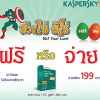 พิเศษเฉพาะงานนี้! เพียงแสดงห่วงมือจับ Kaspersky Lab Hanger ที่ได้จาก MRT มาแสดง รับสิทธิ์แลกซื้อ KIS 1PC หรือ KAV 1PC ในราคาเพียง 50% พร้อมร่วมลุ้นนาทีทอง “ล้วงไข่ฮีโร่” ลุ้นรับ KAV 1PC มูลค่า 690 บาทฟรี! หรือจ่ายเพียง 199 บาท!