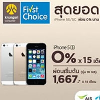 สุดยอดดีล iPhone 5S/5C ผ่อน 0% 15 เดือน เริ่มต้นแค่ 1,667 ต่อเดือนที่กรุงศรี เฟิร์สช้อยส์ เลือกผ่อนมือถือเบา สบาย จ่ายน้อย ผ่อนนาน ทุกรุ่นทุกยี่ห้อ วันนี้ถึง 30 พ.ย. 56 ที่ช้อปมือถือร่วมรายการชั้นนำ ทั่วประเทศ
