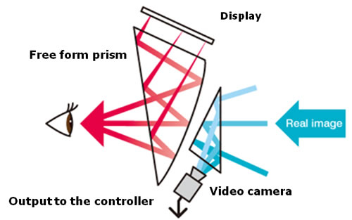 การทำงานของระบบ MR นั้นเริ่มจากกล้องวิดีโอสองตัวที่ติดอยู่บน Head-Mounted Display (HMD) หรืออุปกรณ์แสดงภาพที่ผู้ใช้ต้องสวมครอบอยู่บนศีรษะ กล้องวิดีโอสองตัวนี้จะอยู่ที่ด้านหน้า ทำหน้าที่จับภาพจริงที่ตามองเห็นเพื่อส่งไปยังคอมพิวเตอร์ ณ ตำแหน่งที่กำหนดให้มีภาพ CG เกิดขึ้นจะมีเครื่องหมายในกรอบสี่เหลี่ยมวางอยู่ตามจุด โดยระบบจะคำนวณและวัดตำแหน่งของผู้ใช้จากเครื่องหมายที่กล้องสองตัวนั้นจับภาพได้รวมกับข้อมูลตำแหน่งของผู้ใช้จากเซ็นเซอร์ที่ติดอยู่บน HMD ซึ่งระบบจะทำการจัดเรียงตำแหน่งที่ถูกต้อง และแสดงภาพจริงที่รวมเข้ากับภาพเสมือนบนจอขนาดเล็กใน HMD ภาพที่แสดงอยู่บนจอขนาดเล็กนั้นจะถูกขยายให้ชัดเจนขึ้นด้วยปริซึมทรงอิสระ (Free-form Prism) ที่สามารถเปลี่ยนรูปทรงได้ ทำให้ผู้ใช้ได้สัมผัสกับภาพสามมิติที่มีความคมชัดและมีขนาดสมจริงมากที่สุด