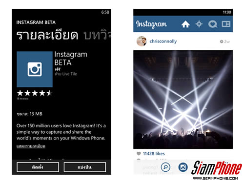 หลังจากที่มีการยืนยันภายในงาน Nokia World 2013 ในกรุงอาบู ดาบี เมื่อปลายเดือนตุลาคมที่ผ่านมาว่า Instagram แอพฯ โซเชียลเน็ตเวิร์คสำหรับการแบ่งปันภาพถ่ายยอดนิยมกำลังจะมีเวอร์ชั่น Windows Phone 8 ในอีกไม่กี่สัปดาห์ข้างหน้า ล่าสุดตอนนี้ใน Windows Phone Store สามารถดาวน์โหลดแอพฯ Instagram อย่างเป็นทางการได้แล้ว