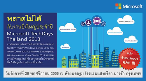 กลับมาอีกครั้งกับงานสัมมนาไอทีประจำปีที่ทุกคนรอคอย! โดยไมโครซอฟท์กับงาน TechDays ที่จัดขึ้นเป็นประจำทุกๆปีทั่วโลก เพื่อให้คอไอทีและนักพัฒนาซอฟต์แวร์ได้แลกเปลี่ยนประสบการณ์ สร้างเครือข่ายของผู้เชี่ยวชาญด้านไอที พร้อมเรียนรู้เกี่ยวกับเทคโนโลยี ผลิตภัณฑ์ และโซลูชั่นล่าสุดต่างๆของไมโครซอฟท์ และในปีนี้ไมโครซอฟท์ได้ปฏิวัติการพัฒนา ดาต้า เซ็นเตอร์ และซอฟต์แวร์ให้สามารถทำงานได้อย่างมีประสิทธิภาพในโลกของดีไวซ์และการบริการ ภายในงานท่านจะได้พบกับระบบปฏิบัติการคลาวด์ (Cloud OS) ล่าสุดจากไมโครซอฟท์ พร้อมร่วมเจาะลึกข้อมูลกับผู้เชี่ยวชาญของไมโครซอฟท์ ในการเปิดตัวทัพผลิตภัณฑ์ วินโดวส์ เซิร์ฟเวอร์ 2012 อาร์ทู (Windows Server 2012 R2), ซิสเต็ม เซ็นเตอร์ 2012 อาร์ทู (System Center 2012 R2), วินโดวส์ 8.1 สำหรับองค์กรธุรกิจ (Windows 8.1 Enterprise), วินโดวส์ อาชัวร์ (Windows Azure), วิช่วล สตูดิโอ 2013 (Visual Studio 2013) และรับชมการสาธิตโซลูชั่นที่ไม่เคยมีมาก่อนในงานนี้ก่อนใคร