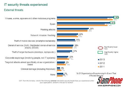 ตารางแสดงจำนวนการโจมตีจากภัยคุกคามต่างๆ เปรียบเทียบ ปี 2011, 2012 และ 2013