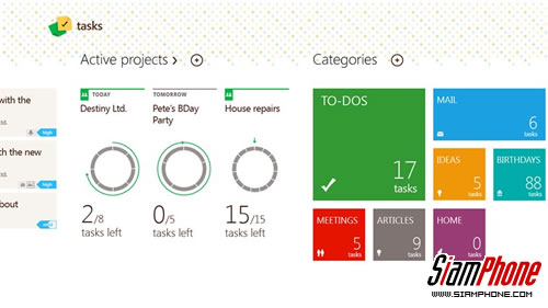 ช่วยคุณพ่อจัดการกับปัญหาการจัดการทั้งเรื่องงานและเรื่องส่วนตัวที่แสนจะวุ่นวายด้วยแอพพลิเคชั่น Tasks แอพฯนี้จะเป็นเพื่อนรู้ใจในการวางแผน จัดการ และตรวจความคืบหน้าของโปรเจ็คต่างๆที่คุณพ่อของคุณกำลังทำอยู่ แอพฯ Tasks สามารถใช้ร่วมกับอุปกรณ์ Windows 8.1 ทุกชนิด