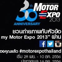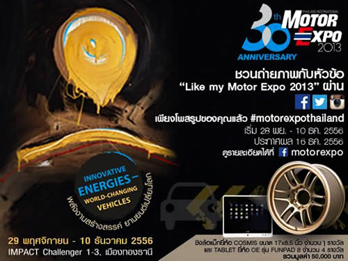 งานมหกรรมยานยนต์ ครั้งที่ 30 ขอเชิญร่วมสนุกกับกิจกรรม “Like My Motor Expo 2013” ลุ้นรางวัลรวมมูลค่ากว่า 50,000 บาท ด้วยกติกาง่ายๆ เพียงถ่ายภาพบรรยากาศในงาน MOTOR EXPO 2013 พร้อมตราสัญลักษณ์ MOTOR EXPO 2013 หรือ ภาพที่มีกรอบ MOTOR EXPO 2013 โดยสามารถโหลดได้จากแอพพลิเคชั่น “MOTOR EXPO” ผ่าน App Store และ Play Store แล้วโพสต์ไปยัง Facebook, Twitter หรือ Instagram (IG) ของตนเอง พร้อมใส่ hashtag ว่า #motorexpothailand ด่วน! ไม่จำกัดจำนวนภาพ หรือ ID ที่เข้าประกวด