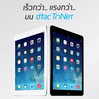 ดีแทค วางจำหน่าย dtac iPad Air พร้อมกันทั่วประเทศแล้ววันนี้ และเตรียมวางจำหน่าย dtac iPad Mini หน้าจอเรติน่า ในวันที่ 4 ธันวาคม 2556 กับหลากหลายแพ็กเกจดีแทคอินเทอร์เน็ตสุดคุ้ม ให้ผู้บริโภคได้เพลิดเพลินอย่างเต็มที่กับประสบการณ์สื่อสารที่รวดเร็วกว่า บน TriNet - 3 โครงข่ายอัจฉริยะบนแบนด์วิธที่กว้างที่สุดจากดีแทค พร้อมสิทธิพิเศษอีกมากมาย รวมถึงแคมเปญพิเศษ “ยิ่งอยู่นาน ยิ่งรักกัน” ที่ให้ลูกค้าดีแทคนำอายุการใช้งานมาเป็นส่วนลดค่าเครื่องได้สูงสุดถึง 2,400 บาท