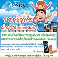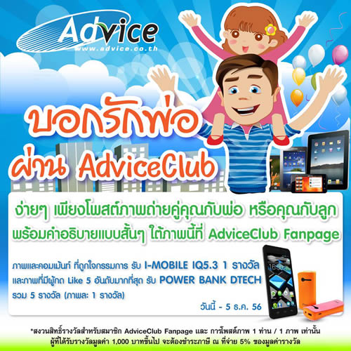 แอดไวซ์ ร่วมส่งเสริมกิจกรรมดีๆ เนื่องในโอกาสวันเฉลิมพระชนมพรรษา 5 ธันวาคม ชวนคุณบอกรักพ่อ ผ่านเฟสบุ๊ค AdviceClub Fanpage ง่ายๆ เพียงโพสต์ภาพถ่ายคู่คุณกับพ่อหรือ คุณกับลูก พร้อมคำบรรยายสั้นๆ ใต้ภาพ โพสต์ไหนโดนใจกรรมการที่สุด รับไปเลย I-MOBILE IQ5.3 จำนวน 1 รางวัล มูลค่า 5,990 บาท และภาพที่มีผู้กด Like มากที่สุด 5 อันดับ รับฟรี Power Bank Dtech ภาพละ 1 รางวัลโดยมีระยะเวลาในการร่วมกิจกรรมตั้งแต่วันนี้ จนถึงวันที่ 5 ธันวาคม 2556 ดูรายละเอียดเพิ่มเติม http://www.facebook.com/AdviceClub