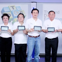 นายจาตุรนต์ ฉายแสง รัฐมนตรีว่าการกระทรวงศึกษาธิการ พร้อมด้วย นายเสริมศักดิ์ พงษ์พานิช (ที่ 3 จากขวา) รัฐมนตรีว่าช่วยการกระทรวงศึกษาธิการ และดร.กิตติ ลิ่มสกุล (ที่ 3 จากซ้าย) ผู้ช่วยรัฐมนตรีประจำกระทรวงศึกษาธิการ และดร.สุทธศรี วงษ์สมาน (ที่ 2 จากซ้าย) ปลัดกระทรวงศึกษาธิการ พร้อมด้วยหน่วยงานภาคเอกชนชั้นนำของประเทศ 90 หน่วยงานร่วมลงนามบันทึกข้อตกลง รวมพลังภาคประชาชนสนับสนุนความ ร่วมมือการสร้างมาตรฐานสื่อการสอนและการเรียนรู้แห่งชาติ (Thailand Digital Education Content Kick off Campaign) ภายใต้แนวความคิด “เด็กไทย ไม่แพ้ใครในโลก ด้วยสื่อการ เรียนการสอนดิจิตัล”