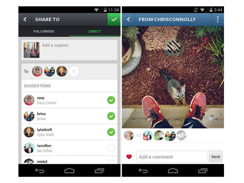 ล่าสุด Instagram ปล่อยให้อัพเดตเวอร์ชั่น 5.0 มาพร้อมฟีเจอร์ใหม่ที่เรียกว่า "Direct" ที่จะช่วยให้ผู้ใช้สามารถแบ่งปันภาพถ่ายหรือวิดีโอให้กับเพื่อนโดยตรง โดยไม่จำเป็นต้องแชร์ผ่านสาธารณะทำให้รู้สึกถึงความเป็นส่วนตัวมากขึ้น ซึ่งสามารถแชร์ให้กับเพื่อนได้พร้อมกันถึง 15 คน นอกจากนี้เพื่อนที่เราแชร์ไปให้สามารถกดไลด์และคอมเม้นใต้รูปภาพได้เหมือนกับตอนที่แชร์ผ่านสาธาณะ