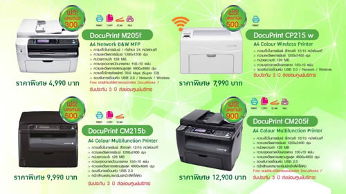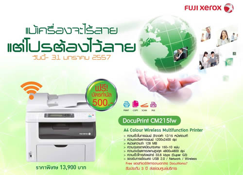 ฟูจิ ซีร็อกซ์ พรินเตอร์ ผู้นำเทคโนโลยีด้านการพิมพ์ระดับโลก ยกทัพเครื่องพิมพ์คุณภาพ ที่มาพร้อมฟังก์ชั่นการทำงานครบครัน ทั้ง พริ้น สำเนา สแกน และส่งแฟกซ์ มาจัดโปรโมชั่นพิเศษส่งท้ายปี “แม้เครื่องจะไร้สาย แต่โปรต้องไว้ลาย” พิเศษแบบจัดเต็ม! สำหรับลูกค้าที่ซื้อเครื่องพิมพ์แบบไร้สาย ในราคาพิเศษสุดแล้ว ท่านยังได้รับฟรีบัตรกำนัลมูลค่าสูงสุดเกือบ 1,000 บาท อาทิ เครื่องพิมพ์มัลติฟังก์ชั่นสี รุ่น DocuPrint CM215fw เสนอในราคาพิเศษเพียง 13,900 บาทเท่านั้น พร้อมรับฟรีบัตรกำนัลมูลค่า 500 บาททันที และ พิเศษ! กับความคุ้มค่าส่งท้ายปี สำหรับลูกค้าที่ซื้อเครื่องพิมพ์มัลติฟังก์ชั่นสีรุ่น DocuPrint CM205f ในราคาพิเศษเพียง 12,900 บาทเท่านั้น และยังรับฟรีบัตรกำนัลมูลค่า 900 บาททันที