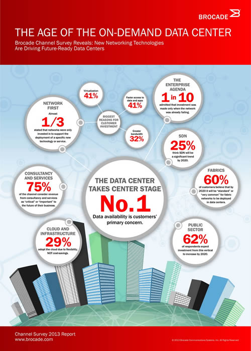 Brocade เปิดเผยผลการสำรวจจากการศึกษาวิจัย “Worldwide Channel Survey” ซึ่งระบุว่า “การจัดหาดาต้าเซ็นเตอร์” เป็นเรื่องที่ลูกค้ากังวลมากที่สุด (ด้วยจำนวนสูงถึง 40% ของผู้เข้าสำรวจทั้งหมด) เมื่อลูกค้าต้องการนำเวอร์ช่วลไลเซชั่นมาใช้งาน การรับเทรนด์ซอฟต์แวร์ดีไฟน์เน็ตเวิร์กกิ้งหรือ SDN และการสนองตอบความต้องการของผู้ใช้งาน ยิ่งไปกว่านั้น ผลสำรวจระบุว่า ความกังวลนี้มีผลให้เกิดการจำกัดนวัตกรรมและการนำแอพพลิเคชั่นและเซอร์วิซยุคใหม่มาใช้งานแสดงถึงโอกาสของแชนแนลเพื่อคว้าข้อได้เปรียบในการแข่งขันทางธุรกิจโดยการผันตัวมาเป็นที่ปรึกษาด้านกลยุทธ์ให้กับองค์กรระดับโลก และช่วยให้องค์กรเข้าใจความสำคัญของสภาพแวดล้อมของดาต้าเซ็นเตอร์รูปแบบแฟบริกต่อเน็ตเวิร์กในปัจจุบัน