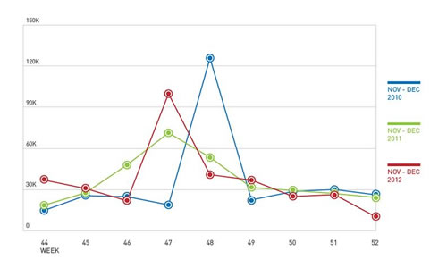 จากการเฝ้าติดตามเว็บไซต์ฟิชชิ่งจำนวนหนึ่งที่ถูกสร้างขึ้นตั้งแต่ปี 2551 ศูนย์วิจัยเทรนด์แล็บส์ได้ให้ความสำคัญกับเว็บไซต์ที่มีกลุ่มเป้าหมายเป็นนักชอปช่วงเทศกาลคริสต์มาส และเทศกาลวันหยุดสำคัญอื่นๆ ซึ่งพบว่ามีเว็บไซต์ดังกล่าวอยู่เป็นจำนวนมากและดำเนินการต่อเนื่องตลอดทั้งปี แต่น่าแปลกใจที่เว็บไซต์เหล่านี้มีจำนวนเพิ่มขึ้นในช่วงปลายปี (รูปภาพที่ 1)