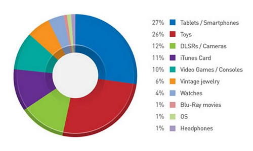 อาชญากรไซเบอร์จะทำการกำหนดเป้าหมายไปที่สินค้าเฉพาะที่ผู้ใช้อาจต้องการค้นหาเมื่อชอปปิ้งออนไลน์ เช่น อุปกรณ์อิเล็กทรอนิกส์ (แท็บเล็ต สมาร์ทโฟน และกล้อง DSLR) ของเล่น วิดีโอเกม/เครื่องเล่นเกม ซอฟต์แวร์ และอื่นๆ เทรนด์ไมโครได้ดำเนินการตรวจสอบสินค้ายอดนิยมที่มีการจำหน่ายและเป็นที่ต้องการในเว็บไซต์ ชอปปิ้งออนไลน์ด้วยการเปรียบเทียบกับเว็บไซต์ฟิชชิ่งที่เราจับตาดูอยู่ และพบว่าสินค้าเหล่านี้เป็นกลุ่มเป้าหมายหลัก (รูปภาพที่ 2)