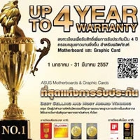 ลูกค้าที่ซื้อผลิตภัณฑ์เอซุส Motherboard และ Graphic Card ภายในระยะเวลาที่กำหนด (วันที่ 1 ม.ค. - 31 มี.ค. 57) จะได้รับสิทธิพิเศษในการลงทะเบียน เพื่อรับการขยายเวลาการรับประกันเพิ่มเป็น 4 ปีเต็ม (นับตั้งแต่วันที่ซื้อผลิตภัณฑ์จากร้านค้า) ภายใต้เงื่อนไขและมาตรฐาน การรับประกันผลิตภัณฑ์ของเอซุส เพียงแค่ลงทะเบียนหลังจากซื้อผลิตภัณฑ์ภายใน 30 วัน โดยอ้างอิงวันที่ใบเสร็จหรือใบกำกับภาษี ดูรายละเอียดและลงทะเบียนได้ที่ช่องทาง เว็บไซต์ http://www.asus.com/event/2014/TH/act/warranty