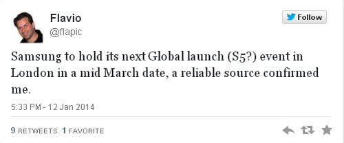 ล่าสุดจากทวิตเตอร์ของนักข่าวอิตาลีที่ใช้นามว่า Flavio ได้ออกมาโพสข้อความเผยว่า "ทาง Samsung เตรียมเปิดตัว S5(?) ในกรุงลอนดอน ประเทศอังกฤษ ช่วงกลางเดือนมีนาคมนี้ พร้อมยืนยันว่าข้อมูลนี้มาจากแหล่งข่าวที่เชื่อถือได้" หากข้อมูลจากทวิตเตอร์ Flavio เป็นความจริงก็เท่ากับว่าภายในเดือนมีนาคมที่จะถึงนี้ เราทุกคนจะได้เห็นหน้าตาของสมาร์ทโฟน Galaxy S5 อย่างแน่นอน