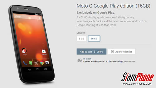 โดย Moto G รุ่น Google Play Edition นี้จะมาพร้อมรอมแบบ Pure Android จาก Google แท้ๆ ไม่มีการครอบทับด้วย UI อื่นแต่อย่างใด และจะได้รับสิทธิ์การอัพเดทโดยตรงจาก Google ที่เป็นเวอร์ชั่นใหม่ของแอนดรอยด์รวดเร็วยิ่งขึ้นไปอีก (จากเดิมก็ได้รับการอัพเดทเร็วอยู่แล้ว) สำหรับราคาและรุ่นวางจำหน่ายนั้นจะเหมือนในรุ่นธรรมดา คือ 8 GB ราคา 179$ (ประมาณ 5,xxx บาท) และรุ่น 16 GB ราคา 199$ (ประมาณ 6,xxx บาท)