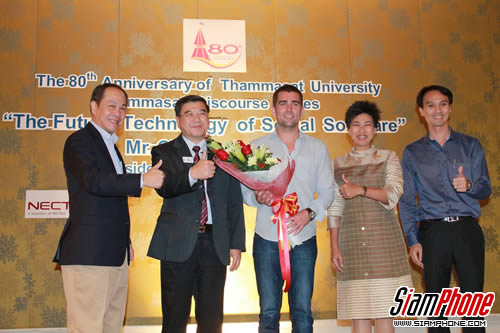 มหาวิทยาลัยธรรมศาสตร์ จัดกิจกรรมในวาระครบรอบ 80 ปีแห่งการสถาปนามหาวิทยาลัย โดยได้รับเกียรติจาก นายคริสโตเฟอร์ คอกซ์ รองประธานด้านผลิตภัณฑ์ เฟซบุ๊ก อิงค์ บรรยายพิเศษหัวข้อ “The Future Technology of Social Software” โดยมีรองศาสตราจารย์ พรชัย ตระกูลวรานนท์ รองอธิการบดีฝ่ายบริหาร ศูนย์ลำปางและพัทยา และผู้ช่วยศาสตราจารย์ ดร. นิธินันท์ วิศเวศวร รองอธิการบดีฝ่ายวิเทศสัมพันธ์ มหาวิทยาลัยธรรมศาสตร์ พร้อมด้วย ดร.ชัย วุฒิวิวัฒน์ชัย หัวหน้าห้องปฏิบัติการวิจัยวิทยาการมนุษยภาษา เนคเทค และนายนิพพิชน์ นริญปพันธุ์ ผู้ช่วยผู้อำนวยการ กลุ่มธุรกิจการศึกษา บมจ. ทรู คอร์ปอเรชั่น ให้การต้อนรับ