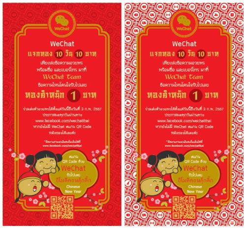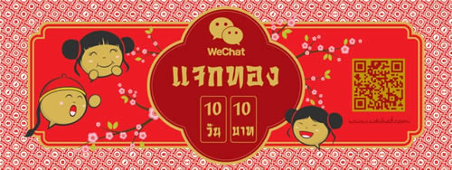 WeChat ผู้นำนวัตกรรมด้านการสื่อสารด้วยโซเชียลแอพพลิเคชั่นผ่านอุปกรณ์มือถือยอดนิยม เชิญชวนขาแชททุกคนมาเฮง เฮง เฮง รับตรุษจีนปีม้าทองกับอั่งเปาเป๋าตุง ลุ้นรับกันง่ายๆ กับทองคำ 10 วัน 10 บาทฉลองเทศกาลซินเจียยู่อี่ ซินนี้ฮวดไช้ เพียงส่งขอความอวยพรผ่าน WeChat พร้อมชื่อ และเบอร์โทร มาที่ WeChat Team ข้อความไหนอวยพรได้เก๋ไก๋ ได้โชค โดนใจ รับไปเลยทองคำวันละ 1 บาท จำนวน 10 รางวัล ร่วมส่งคำอวยพรได้ตั้งแต่วันนี้ถึงวันที่ 3 กุมภาพันธ์ 2557 นี้
