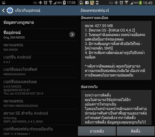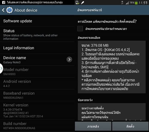 หลังจากทาง Samsung ได้ปล่อยอัพเดทตัวใหม่แอนดรอยด์ 4.4.2 Kitkat ให้กับ Galaxy Note 3 ไปแล้วในบางประเทศ และล่าสุดก็ได้เปิดให้ผู้ใช้งานในประเทศไทยได้ทำการอัพเดทกันแล้ว ซึ่งรองรับ Galaxy Note 3 ทั้งรุ่น Exynos และ Snapdragon LTE โดยรุ่น Exynos มีขนาดไฟล์ 379.08 MB และรุ่น Snapdragon มีขนาดไฟล์ 427.95 MB