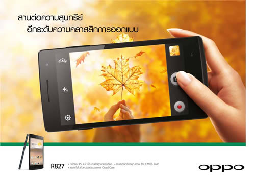 OPPO Find 5 mini (R827T) สมาร์ทโฟนดีไซน์สวยที่สร้างต่อยอดความสำเร็จมาจาก OPPO Find 5 มาพร้อมกับหน้าจอ IPS 4.7 นิ้ว ความละเอียด 960 x 540 พิกเซล RAM 512MB ROM 4GB เพิ่ม microSD ได้สุงสุด 32GB รองรับ 2 ซิมการ์ด มีกล้อง 2 ตัวคือ กล้องหน้า 2 ล้านพิกเซล กล้องหลัง 8 ล้านพิกเซล ระบบปฏิบัติการ Color OS ที่มีลูกเล่นหลากหลายเหมือน OPPO Neo เช่นกัน