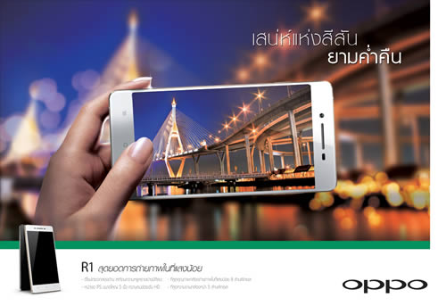 ตัวต่อมาถือเป็นสมาร์ทโฟนไฮไลท์ของงานคือ OPPO R1 ที่ชูจุดเด่นกล้องที่ถ่ายภาพได้สวยแม้ยามค่ำคืนด้วย PI Engine ที่อยู่ในกล้องหน้าและหลังจะช่วยลด Noise ในภาพถ่ายพร้อม เซนเซอร์ IMX 179, รูรับแสง F 2.0 รับแสงได้มากยิ่งขึ้นทำให้ภาพถ่ายกลางคืนจาก R1 มีทั้งความสว่างคมชัด นอกจากนั้นตัวเครื่องผ่านขั้นตอนออกแบบอย่างพิถีพิถันพร้อมใช้วัสดุชั้นยอดอย่างอลูมิเนียมอัลลอย ช่วยเพิ่มความหรูหราและเสริมความแข็งแรง หน้าจอของ R1 เป็น Gorilla Glass 3 ขนาด 5 นิ้ว ความละเอียด 1280×720 พิกเซล CPU Quad-Core 1.3 GHz RAM 1GB ROM 16GB และ Color OS ที่เพิ่มลูกเล่นการใช้งานได้หลากหลาย