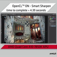 Photoshop CC เวอร์ชั่นล่าสุดนี้เป็นซอฟแวร์หลักตัวหนึ่งของ Adobe Creative Cloud™ ซึ่งพัฒนาขึ้นจากพื้นฐานความสำเร็จของ Photoshop รุ่นก่อนๆ โดยมี OpenCL™ ช่วยเพิ่มประสิทธิภาพให้กับ Blur Gallery นอกจากนี้ Smart Sharpenเวอร์ชั่นล่าสุดของยังช่วยเสริมประสิทธิภาพของการทำงานแบบคู่ขนานของ OpenCL ทำให้ผู้ใช้ได้รับประโยชน์จากกราฟิกการ์ดและ APU ของเอเอ็มดีได้โดยตรง เพื่อเพิ่มประสิทธิภาพการเชื่อมโยงและประมวลผลทั้งหมด ของ Smart Sharpen ไม่ว่าจะเป็น Amount, Radius, Reduce Noise และ algorithm choice เทคโนโลยีด้านกราฟิกล่าสุดจากเอเอ็มดีนั้น สามารถเพิ่มศักยภาพให้กับแอพพลิเคชั่นต่างๆได้มากกว่าการใช้งานแบบ non-OpenCL ถึง 11 เท่า อีกทั้งยังมอบประสบการณ์การแก้ไขภาพหรือกราฟิกที่รวดเร็ว แม้กระทั่งกับภาพขนาดใหญ่