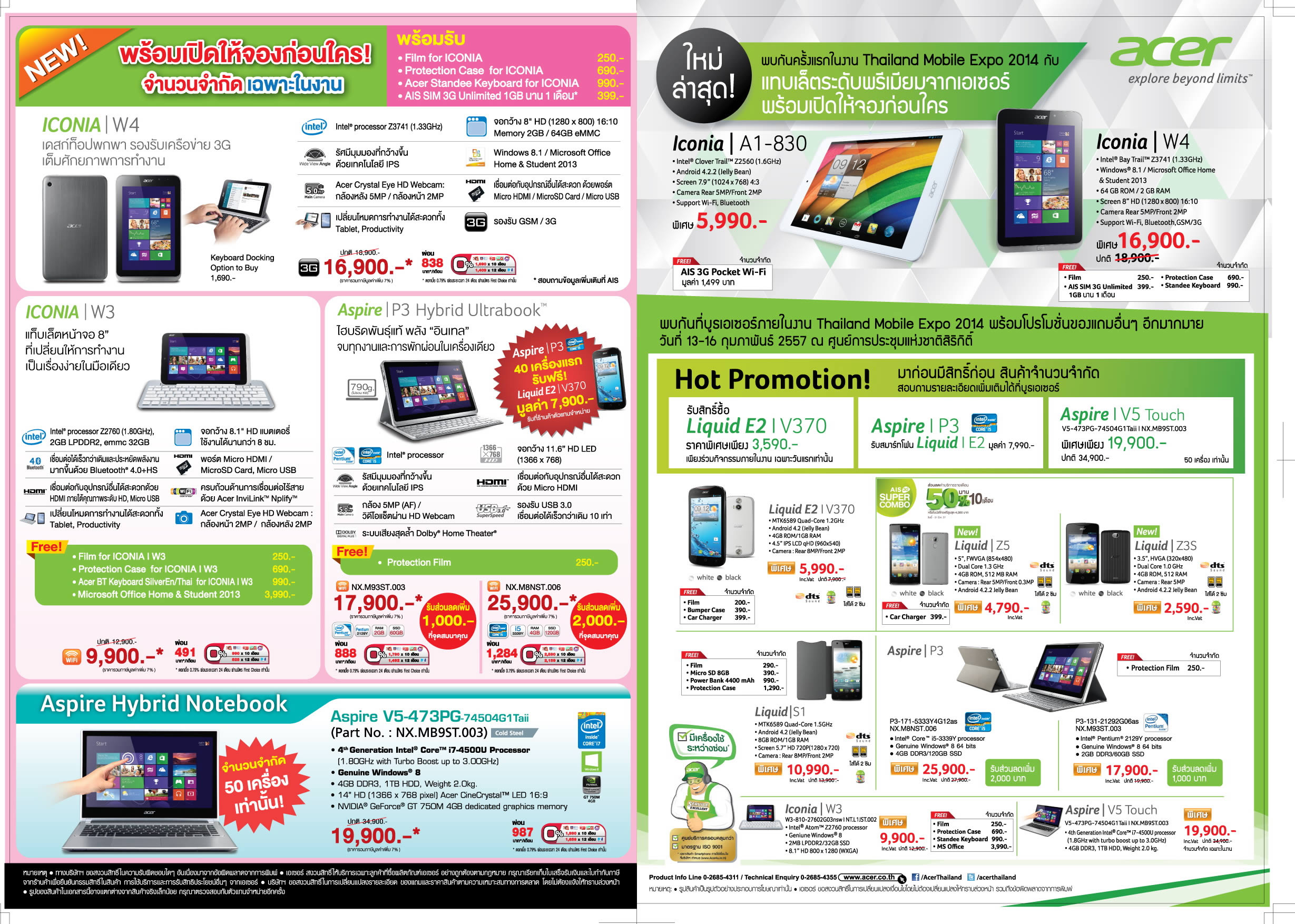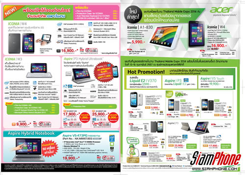 พบกับแท็บเล็ตระดับพรีเมี่ยมจาก Acer ครั้งแรกในงาน Thailand Mobile Expo 2014 พร้อมเปิดให้จองก่อนใคร อาทิเช่น Iconia A1 - 830 ในราคา 5,990 บาท , Iconia W4 ในราคา 16,900 บาท