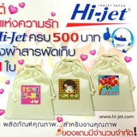 เมื่อซื้อสินค้าไฮ-เจ็ท ครบทุกๆ 500 บาท รับฟรี!! ถุงผ้าสารพัดเก็บลายน่ารักทันที 1 ใบ ผลิตภัณฑ์คุณภาพ สำหรับงานคุณภาพ สนใจแวะชมสินค้าได้ที่ ร้านไอทีซูเปอร์สโตร์ ร้านเครื่องเขียน และห้างสรรพสินค้าชั้นนำทั่วไป (เฉพาะสาขาที่ร่วมรายการ) หรือสอบถามรายละเอียดเพิ่มเติมได้ที่ บริษัท ปภาวิน จำกัด โทร.02-423-3555 หรือเว็บไซต์ http://www.hi-jet.com