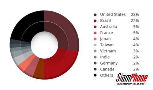 ประเทศสหรัฐอเมริกา และประเทศบราซิลมีจำนวนเหยื่อของมัลแวร์ธนาคารมากถึงครึ่งหนึ่งของเหยื่อทั้งหมด