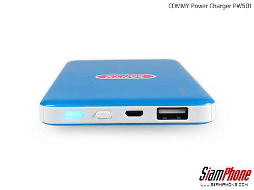 COMMY Power Charger PW501 มีรูปทรงสี่เหลี่ยมพื้นผ้า ด้านบนมีไฟแจ้งเตือนสถานะแบตเตอรี่คงเหลือ 2 ดวง, ถัดมามีปุ่ม-ปิด, ช่องเสียบ Micro USB สำหรับชาร์จไฟเข้าตัวแบตเตอรี่สำรอง และสุดท้ายมีช่องเชื่อมต่อ USB สำหรับชาร์จกับอุปกรณ์