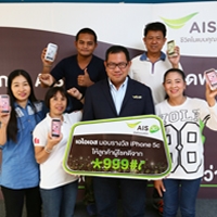 AIS 3G 2100 โดย นายฐิติพงศ์ เขียวไพศาล ผู้ช่วยกรรมการผู้อำนวยการอาวุโสสายงานการตลาดและการขาย มอบรางวัลมือถือ iPhone 5c 16GB มูลค่ารวมกว่า 414,000 บาท ให้แก่ลูกค้าผู้โชคดีจากแคมเปญ *999# โทรออก เพื่อกดรับสิทธิพิเศษในการซื้อมือถือ 3G