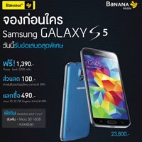 บานาน่า ไอที และ บานาน่า โมบาย ผู้นำร้านค้าปลีกสินค้าไอที เอาใจสาวกซัมซุง เปิดให้จองกันอย่างเป็นทางการแล้วกับ Samsung Galaxy S5 สมาร์ทโฟนอัฉริยะรุ่นใหม่ล่าสุดที่มาพร้อมกับประสิทธ์ภาพหลากหลาย พร้อมให้คุณเป็นเจ้าของง่ายๆ ก่อนใครได้ที่บานาน่า ไอที และบานาน่า โมบาย ทั่วประเทศ ตั้งแต่วันที่ 24 มี.ค.- 10 เม.ย.2557 เท่านั้น ทั้งยังขนโปรโมชั่นมาเอาใจคอไอที อินเทรนอีกมากมาย เพียงจอง Samsung Galaxy S5 ที่บานาน่า ไอที หรือ บานาน่า โมบาย รับฟรี Power Bank 5200 mAh มูลค่า 1,390 บาท, ซื้อประกันอุบัติเหตุเพิ่มรับส่วนลดทันที 100 บาท จากราคาปรกติ 599 บาทเหลือเพียง 499 บาท และ แลกซื้อ Kingston SD 32 GB จากปรกติ 699 บาท เหลือเพียง 490 บาท