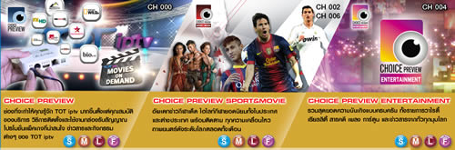 รับชมได้รวม 110 ช่องรายการ (90 ช่องพื้นฐาน 20 ช่องพรีเมี่ยม) ได้แก่ Starworld HD, FOX Crime HD, Sun Channel La Liga HD, Nat Geo Wild HD, Nat Geo People HD, BIO HD, Universal, KIX, Fashion TV, Channel V International, Boomerang ฯลฯ สนใจสมัครโทร 02 - 500 -1111 หรือติดต่อศูนย์บริการลูกค้าทีโอทีทุกสาขาทั่วประเทศ หรือ http://www.totiptv.com/index.html