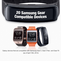 ข่าวดีสำหรับผู้ที่ชื่นชอบการออกกำลังกายเมื่อ Samsung ประกาศรายชื่ออุปกรณ์สมาร์ทโฟนและแท็บเล็ตรุ่นที่สามารถใช้งานร่วมกับนาฬิกาและสายรัดข้อมืออัจฉริยะตระกูล Gear รุ่นที่สอง (Samsung Gear 2, Samsung Gear 2 Neo, Samsung Gear Fit) นอกเหนือจากอุปกรณ์สมาร์ทโฟนรุ่นใหม่ที่เปิดตัวออกมาพร้อมกันอย่าง Samsung Galaxy S5 แล้วก็มีสมาร์ทโฟนของ Samsung รวมทั้งหมด 20 รุ่นที่ใช้งานร่วมกันได้