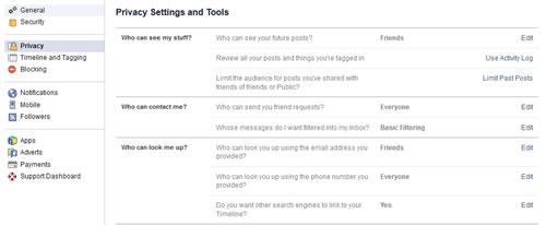 อีกวิธีที่สำคัญในการป้องกันคือ การตั้งค่าเลือกผู้ที่จะสามารถเห็นข้อมูลและโพสต์ของคุณ เครื่องมือความเป็นส่วนตัวของ Facebook ช่วยให้คุณกำหนดผู้ที่จะเข้าชมไทม์ไลน์ ข้อมูลส่วนบุคคล รวมถึงโพสต์และรูปภาพต่างๆ ของคุณได้อย่างเต็มที่ โดยแบ่งเพื่อนเป็นกลุ่มต่างๆ และกำหนดสิทธิ์ในการเข้าชมของแต่ละกลุ่ม นอกจากนี้ ยังเลือกได้ว่าแอพลิเคชั่นต่างๆ สามารถเข้าถึงข้อมูลของคุณได้มากน้อยเพียงใดอีกด้วย โดยตั้งค่าความเป็นส่วนตัวได้ที่ “ทางลัดความเป็นส่วนตัว” บนมุมขวาของทุกหน้า (สัญลักษณ์รูปแม่กุญแจ) หรือที่ลิงค์ https://www.facebook.com/settings/?tab=privacy&ref=mb