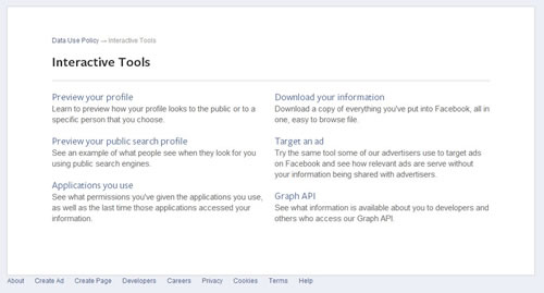 Facebook ยังมีเครื่องมือด้านความเป็นส่วนตัวอื่นๆ หรือ Interactive Tools เพื่อให้ตรวจสอบได้ว่าบุคคลทั่วไปจะเห็นโปรไฟล์ส่วนตัวของคุณมากน้อยเพียงไร โดยจะทำให้คุณเห็นไทม์ไลน์ของตัวเองในมุมมองที่บุคคลทั่วไปเห็น เมื่อพวกเขาค้นหาคุณจากโปรแกรมค้นหาต่างๆ และยังมีเครื่องมืออื่นๆ ที่มีประสิทธิภาพโดยอ่านรายละเอียดเพิ่มเติมได้ที่ https://www.facebook.com/about/privacy/tools