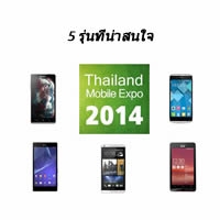 งานมหกรรมโทรศัพท์มือถือแห่งชาติ หรือ Thailand Mobile Expo 2014 กำลังจะเริ่มขึ้นอีกครั้งในวันพฤหัสที่ 8 พฤษภาคมที่จะถึงนี้ โดยภายในงานครั้งนี้ มีสมาร์ทโฟนที่น่าสนใจหลากหลายรุ่นมาเปิดตัวภายในงาน และอาจทำให้หลายคนที่กำลังมองหาสมาร์ทโฟนเครื่องใหม่ให้ตัวเองหรือให้คนสนิทเกิดการลังเลใจว่า ตอนนี้มีสมาร์ทโฟนรุ่นไหนบ้างภายในงานที่น่าสนใจและราคาที่คุ้มค่า เรามีตัวเลือกมาแนะนำสมาร์ทโฟน 5 รุ่นภายในงานที่น่าสนใจ สามารถติดตามได้จากข้างล่างนี้