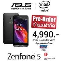 “ZenFone 5” มาพร้อมกับจอแสดงผลขนาด 5 นิ้ว ใช้เวลาตอบสนองการสัมผัสเพียง 0.06วินาที ซึ่งรวดเร็วที่สุดในตลาดสมาร์ทโฟนปัจจุบัน พร้อมเทคโนโลยี Corning® Gorilla® Glass 3 สำหรับป้องกันการขีดข่วน สามารถใช้งานได้แม้สวมถุงมือ รองรับ 2 ซิม และ 3G ทุกเครือข่าย ประมวลผลด้วย Intel® Atom™ Processor Z2560 1.6Ghz with Intel® Hyper-Threading Technology บนระบบปฏิบัติการ Android™ 4.3 (สามารถอัพเกรดเป็น Android™ 4.4 KitKat) แรม 1 GB ความจุ 8 GB เพิ่มเมมได้สูงสุด 64 GB กล้องหลัง 8 ล้าน พร้อมเทคโนโลยี Pixel Master โดยคุณสมบัติพิเศษมากมาย เช่น Low-Light Mode และ Time Rewind พิเศษ! เปิดจอง “ZenFone 5” เฉพาะในงาน Thailand mobile expo 2014 Hi-End ในราคาสุดคุ้มเพียง 4,990 บาทเท่านั้น! (รวมภาษีมูลค่าเพิ่ม) จำนวนจำกัด! บูทเอซุส PM 6/2 เท่านั้น