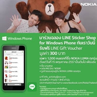 มาร่วมฉลอง Line Sticker Shop for Windows Phone กับโนเกียรับฟรี Line Gift Voucher มูลค่า 300 บาท เฉพาะ 1,000 คนแรกที่ซื้อ Nokia Lumia ทุกรุ่น ตั้งแต่วันที่ 15 พฤษภาคม 2557 เป้นต้นไป