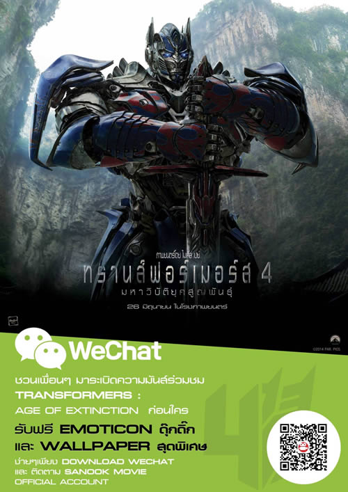 WeChat ผู้นำนวัตกรรมด้านการสื่อสารด้วยโซเชียลแอพพลิเคชั่นผ่านอุปกรณ์มือถือยอดนิยม จับมือ United International Pictures Thailand (UIP Thailand) มอบสิทธิพิเศษจัดเต็มเอาใจคอหนังทุกท่านให้ได้สัมผัสความมันส์ของอภิมหาภาพยนตร์แห่งปี “Transformers: Age of Extinction” ได้ก่อนใคร เพียงร่วมกิจกรรมสนุกๆ ผ่าน “Sanook Movie Official Account” ก็มีสิทธิลุ้นเป็นผู้โชคดีไปชมภาพยนตร์รอบพิเศษก่อนใครได้ทันที
