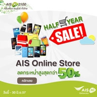 AIS Online Store ขนทัพสมาร์ทโฟน แท็บเล็ต และอุปกรณ์ไอทีต่างๆ มากมาย รวมถึงซิมเบอร์สวย มาลดกระหน่ำสูงสุดกว่า 50% ในโปรโมชั่น Half Year Sale วันนี้ – 30 มิถุนายน นี้ ติดตามรายละเอียดเพิ่มเติมได้ที่ http://www.ais.co.th/onlinestore/sale/