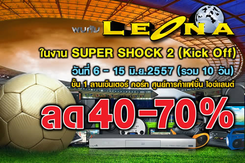 และพบกับสินค้าใหม่คุณภาพเยี่ยมอีกหลายรายการ อาทิ เครื่องเล่น Leona DVD และ DVD Blu-Ray ลำโพงไมโครซิสเตม (Micro System) วิทยุกระเป๋าหิ้วพกพา และกล่องรับสัญญาณดิจิตอลทีวี (Digital TV Set Top Box) เป็นต้น ขอเชิญทดสอบและเลือกซื้อสินค้า Leona กับโปรโมชั่นและส่วนลดพิเศษนี้ได้ที่บูธ Leona พร้อมร่วมกิจกรรมมากมายภายในงานฯ ตั้งแต่วันที่ 6-14 มิถุนายน 2557 เวลา 10.00 – 20.00 น. ณ ชั้น 1 ลานเซ็นเตอร์คอร์ท ศูนย์การค้าแฟชั่นไอซ์แลนด์ (ถ.รามอินทรา) และติดตามกิจกรรมสนุก ๆ ของ Leona ได้ทาง www.leonathai.com หรือสอบถามรายละเอียดโทร. 0-2945-4507-12
