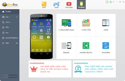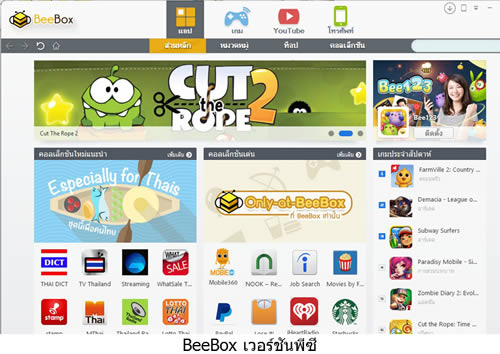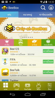 BeeBox มีทั้งเวอร์ชั่นพีซีและแอนดรอยด์ ภายในแอพพลิเคชั่น BeeBox นำเสนอช่องทางดาวน์โหลดแอพพลิเคชั่นแอนดรอยด์ฟรี จำแนกหมวดหมู่ของแอพพลิเคชั่นและเกมส์ด้วยโทนสีสันสดใส รูปแบบที่ใช้งานง่าย นอกจากนี้ยังมีเครื่องมือที่จำเป็นสำหรับการใช้งานบนสมาร์ทโฟนแอนดรอยด์มาให้ใช้ฟรี!