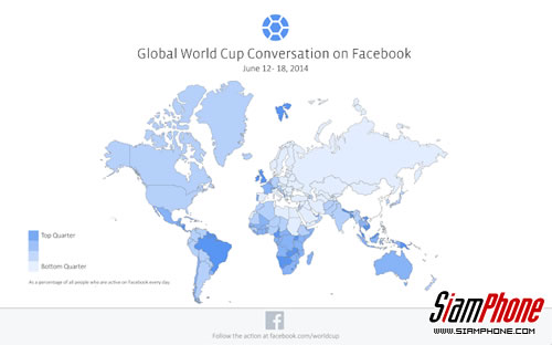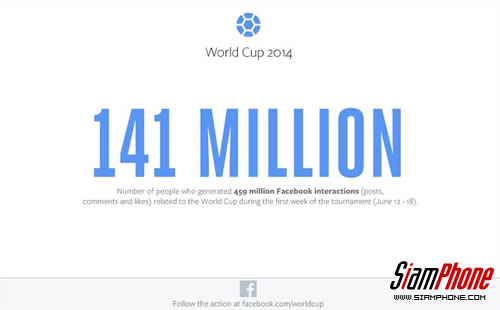 ในเวลาเพียง 1 สัปดาห์ มีผู้คนพูดคุยเกี่ยวกับการแข่งขันระดับโลกนี้บน Facebook มากกว่าจำนวนการพูดคุยของเหตุการณ์สำคัญอื่นๆ ของปีนี้ทั้งหมดรวมกัน ได้แก่ การแข่งขันซูเปอร์โบวล์, ออสการ์ และโอลิมปิคฤดูหนาว โซชิ เกมส์ และยังเหลือเวลาอีกถึง 3 อาทิตย์ก่อนที่การแข่งขันทัวร์นาเมนท์ระดับโลกครั้งนี้จะจบลง! ตัวเลขล่าสุดของผู้ที่ใช้ Facebook ในการค้นหาเรื่องราวเกี่ยวกับทีมและผู้เล่นคนโปรด รวมถึงพูดคุยเกี่ยวกับเหตุการณ์ที่เกิดขึ้นระหว่างทัวร์นาเมนท์มีดังนี้