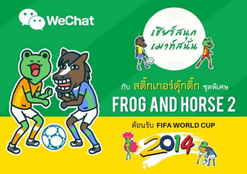 WeChat โซเชียลแอพพลิเคชั่นจี๊ดจ๊าด ร่วมต้อนรับการแข่งขันฟุตบอลโลก 2014 FIFA World Cup Brazil เอาใจแฟนบอลให้ได้อินไปกับกระแสศึกฟาดแข้งระดับโลก ด้วยการปล่อยสติ๊กเกอร์ดุ๊กดิ๊กได้ไม่เหมือนใครชุดพิเศษ! “Frog and Horse 2” คู่ซี้สุดฮา มาให้แฟนๆได้ดาวน์โหลด ส่งให้เพื่อนสื่ออารมณ์แทนคำพูดและตัวอักษร เพิ่มสีสันความเพลิดเพลินในการแชทและเชียร์ฟุตบอลไปพร้อมกัน